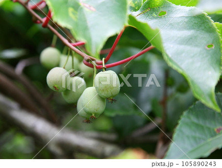 自然 植物 サルナシ、初夏の若い果実。山野に自生し野生動物の好物、果実酒やジャム、生食にもなります