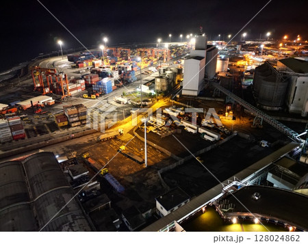 マダガスカルのトアマシナ港の貨物置き場の夜景の空撮