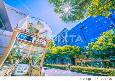日本の東京都市景観 東京・表参道の緑溢れる並木や表参道駅出入口A2などを望む。右にアルマーニ