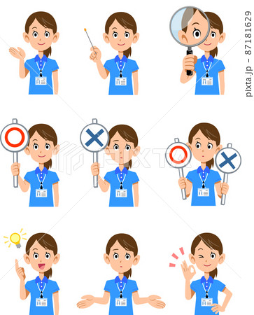 半袖のポロシャツ姿でネームタグを身に着けた女性スタッフの9種類のポーズと表情2