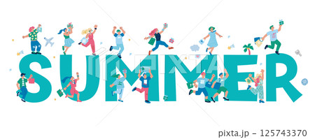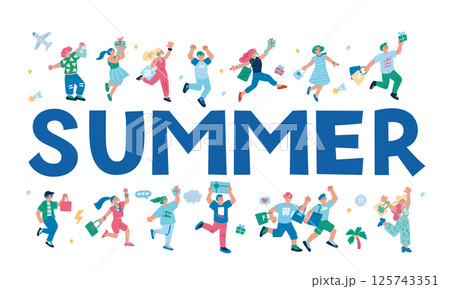 SUMMER プレゼントやショッピングで喜ぶ人々の手書きのイラスト