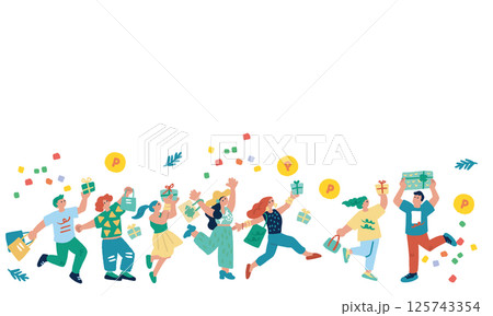 ポイントキャンペーン プレゼントやショッピングで喜ぶ人々の手書きのイラスト