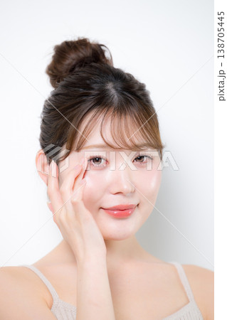若い女性のアイメイクや目元や目に触れる笑顔のスキンケアイメージクローズアップ