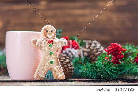 Gingerbread man near cup and Pine branch
