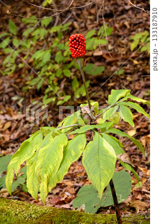 秋になり、赤く色づき始めたマムシグサの実が森の中で鮮やかに映え、季節の深まりを静かに告げています。