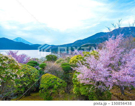 恩賜箱根公園の弁天の鼻展望台に咲く満開のまめさくらと芦ノ湖の向こうに富士山が見える風景