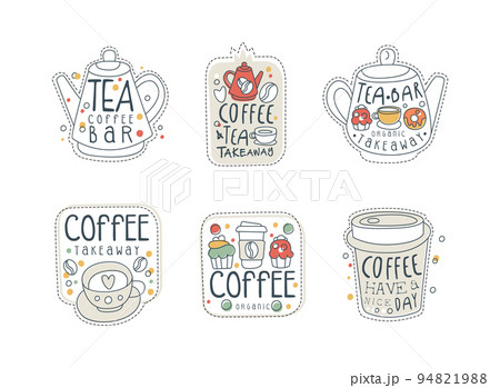 Tea coffee bar labels set. Takeaway drinks hand drawn labels, stickers, prints vector illustration
