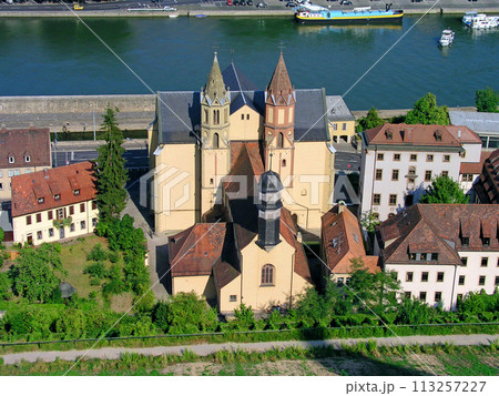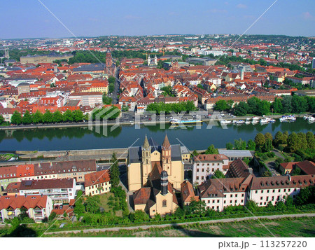 ドイツ ヴュルツブルグ マイン川左岸の聖ブルカート教会と丘の上のマリエンベルグ要塞