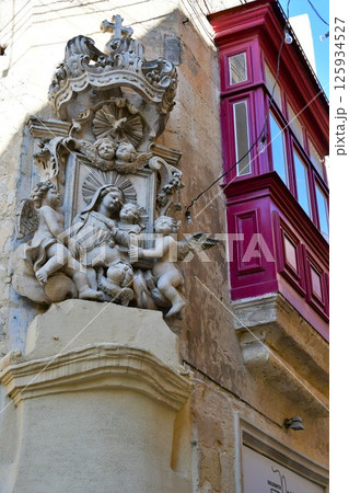 マルタ共和国、マルタ島、ラバト、街角の聖母子像、出窓