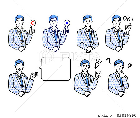 スーツにネクタイ姿のビジネスマンのマルバツやオッケーなどの表情バリエーションの白背景に線画のシンプル