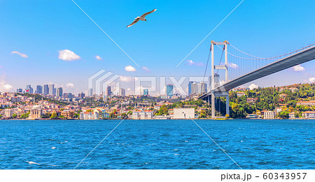 The boat near the Bosphorus bridge and modern Istanbul view, Turkey