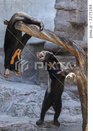 動物園の飼育スペースの登り木の上の1頭のマレーグマのいる風景