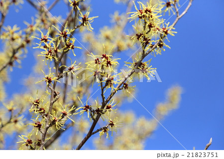 写真 春一番に咲く青空に映えるマンサクの黄色い花