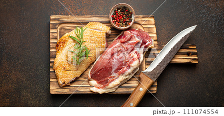 Two raw uncooked duck breast fillets with skin, seasoned with salt, pepper, rosemary top view on wooden cutting board with knife, dark brown concrete rustic background