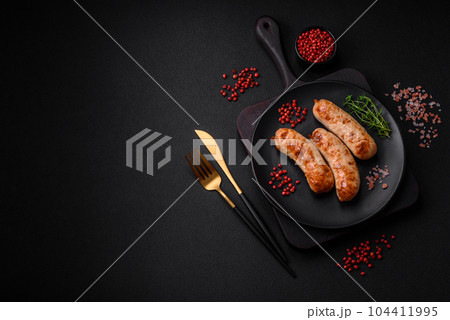 Delicious juicy grilled sausages with salt, spices and herbs on a ceramic plate