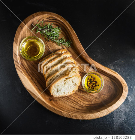 Freshly Baked Bread with Olive Oil and Rosemary on Wooden Board