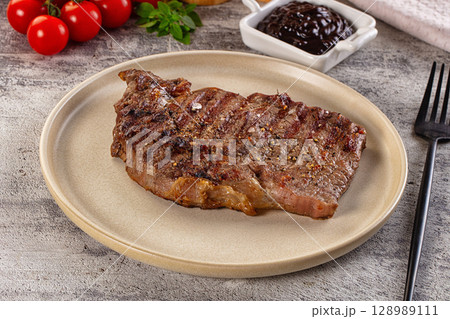 Juicy beef steak baked on the grill with salt, spices and herbs