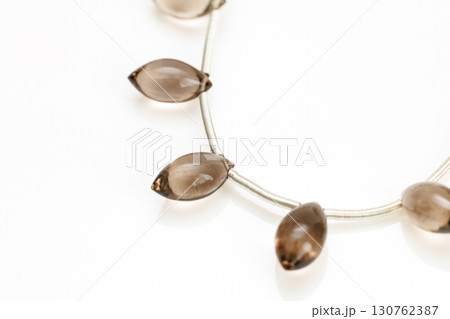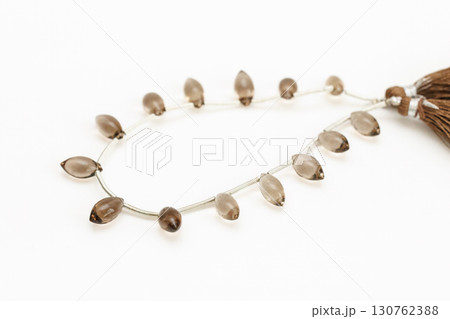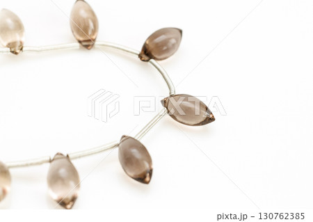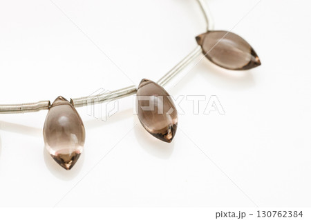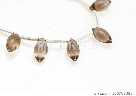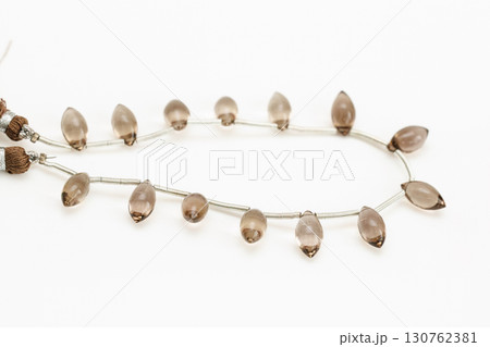 白背景に並んだスモーキークォーツのマーキスカットビーズストランド