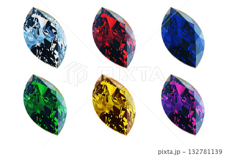斜めから見たマーキスカットの色違いの宝石のCGイラスト。6色の推しカラーのダイヤンド