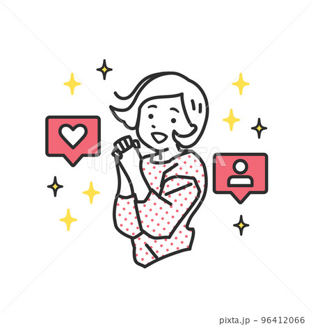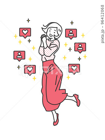 SNSでいいねやフォローを獲得して、ジャンプして喜ぶ女性のシンプルイラスト
