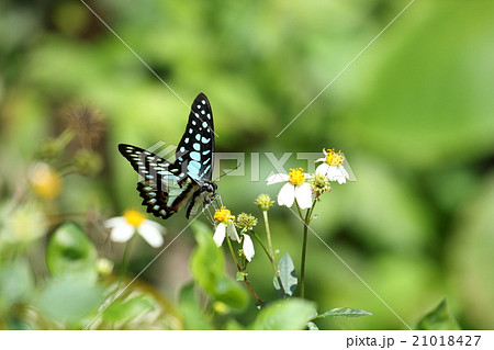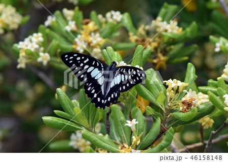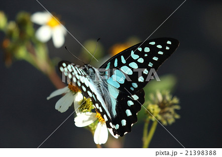 生き物 昆虫 ミカドアゲハ、沖縄、八重山亜種。翅の模様がアオスジアゲハのようなきれいな水色です