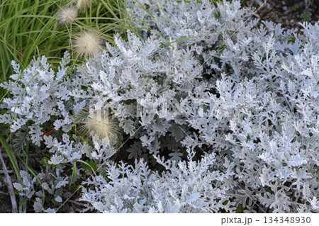 Panicles of miscanthus and Silver Wormwood plants form a carpet of fancy leaves