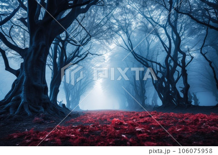 Fantasy dark forest with fog and red leaves. Halloween concept.
