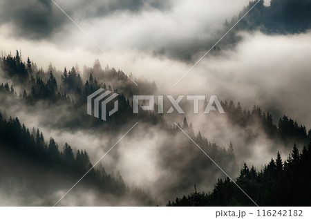 Misty Carpathian Mountains fog landscape Foggy morning green fir trees Scenic forest rainy day Calm tranquil Carpathians