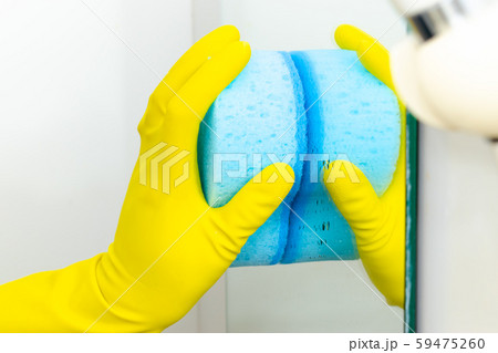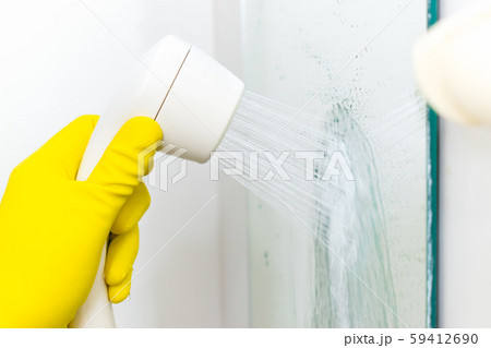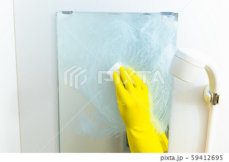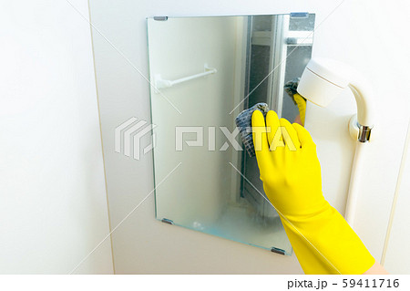 風呂掃除 洗剤を持つ 壁 鏡 大掃除