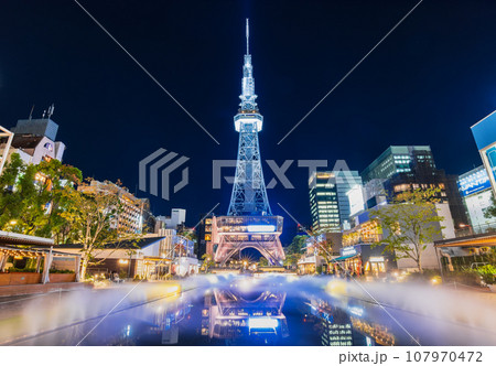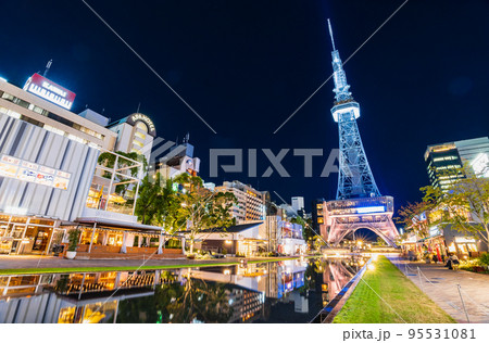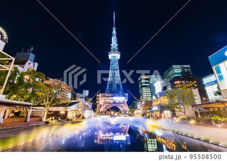 ライトアップされた名古屋テレビ塔と久屋大通公園のミズベヒロバの映り込み