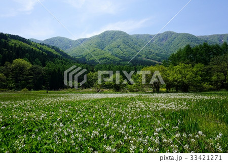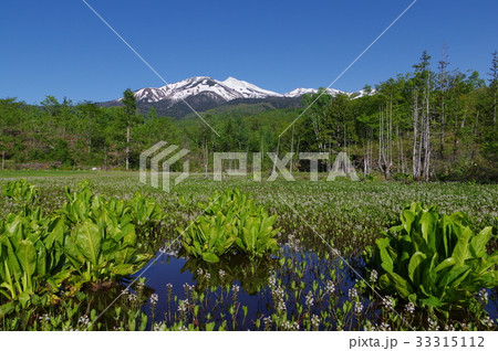 信州の高原 乗鞍高原のどじょう池より乗鞍岳を望む 水芭蕉やミツガシワが咲く6月の風景