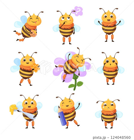 Honey bees characters. Cartoon bee mascot, flying honeybee adorable wasp cute characters with happy face expressions animal insect bug children series set, neat vector illustration