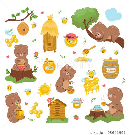 Bear and honey. Cartoon bees bears, cute forest animal flying bee and honeycomb. Sweet healthy food in jar, wild nowaday vector comic characters