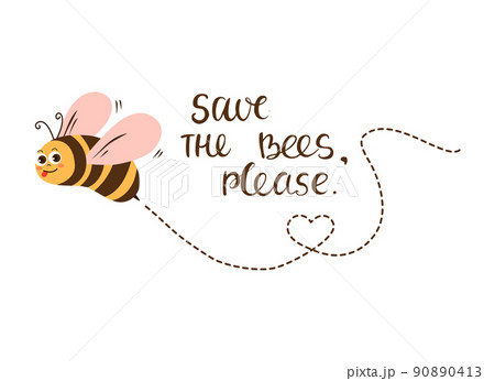 Cartoon bee flying on a dotted route isolated on the white background. With text. Vector illustration.