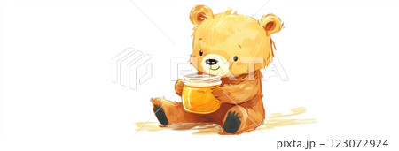 Cute illustrated teddy bear holding a jar of honey sitting on the ground in a bright and cheerful setting. Generative AI