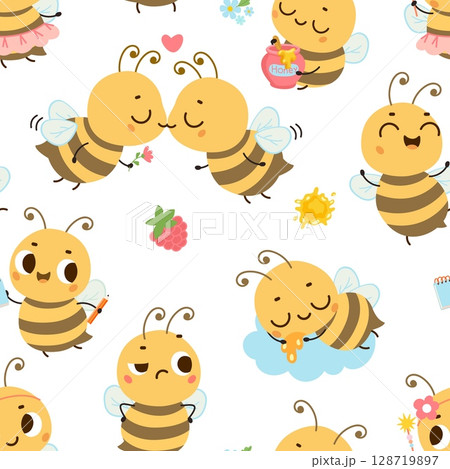 Bee seamless pattern. Cartoon bee different poses, princess, student, sleeping insect, flying in love. Print template for children fabric, vector background