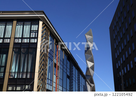 ロマンチック茨城(快晴の大空に浮かぶウエディングリング。)水戸市、水戸芸術館シンボルタワー