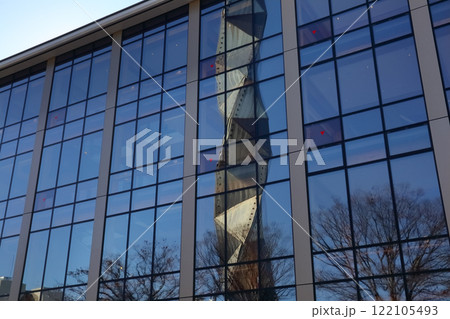 ロマンチック茨城(水戸市民会館の窓に芸術館の幾何学的なタワーが歪み映る。正に芸術的だ。)水戸市