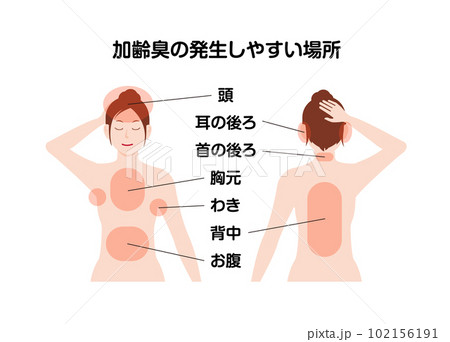 加齢臭の発生しやすい部位 女性の上半身図解ベクターイラスト