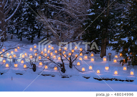 横手の雪まつり ミニかまくらの雪あかりが並ぶ夜景 冬の背景素材(秋田・横手)