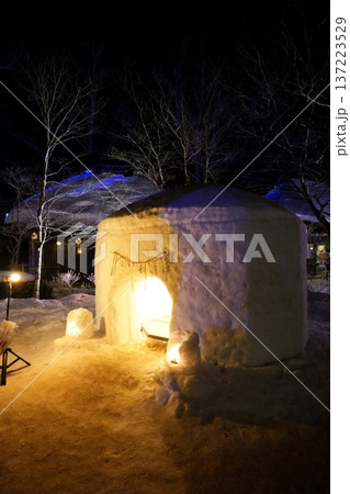 寒い夜に建つ温かみのあるかまくら