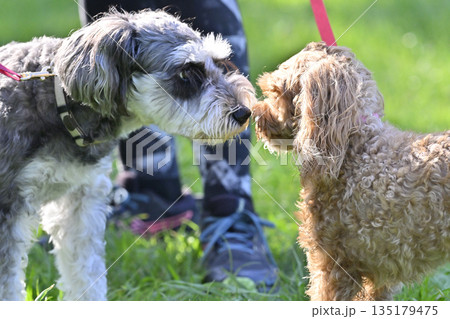 大型犬と小型犬の挨拶 スタンダードプードル。ミニチュアシュナウザー