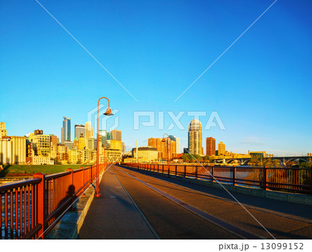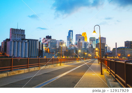 ミネソタ州ミネアポリスのストーンアーチ橋とダウンタウンの夜景