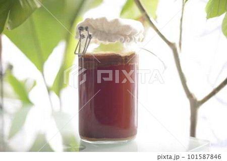瓶の中で発酵している緑茶の高活性コンブチャ