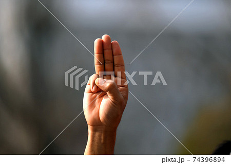 The three finger of Myanmar man raised as a protest sign with Myanmar flag background
