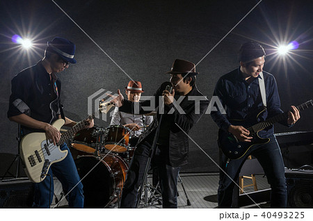 Musician band hand holding the microphone and singing a song and playing music instrument with Fellow band musicians on black background with spot light and lens flare, musical concept
