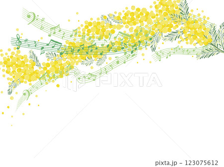 ミモザアカシアと音楽の背景 ベクター 音符 五線譜 発表会 演奏会 吹奏楽 花柄 春