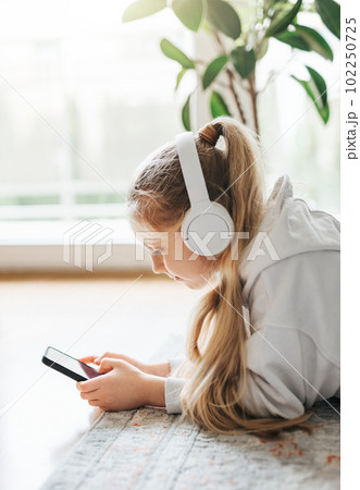 Little girl listening music lying on the floor