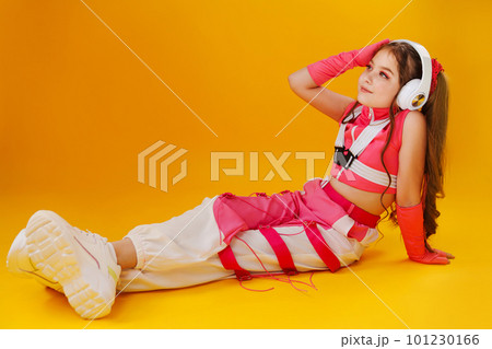 a teenage girl in a pink stage costume and headphones on a yellow background.