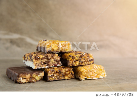Various muesli bars on marble stone background